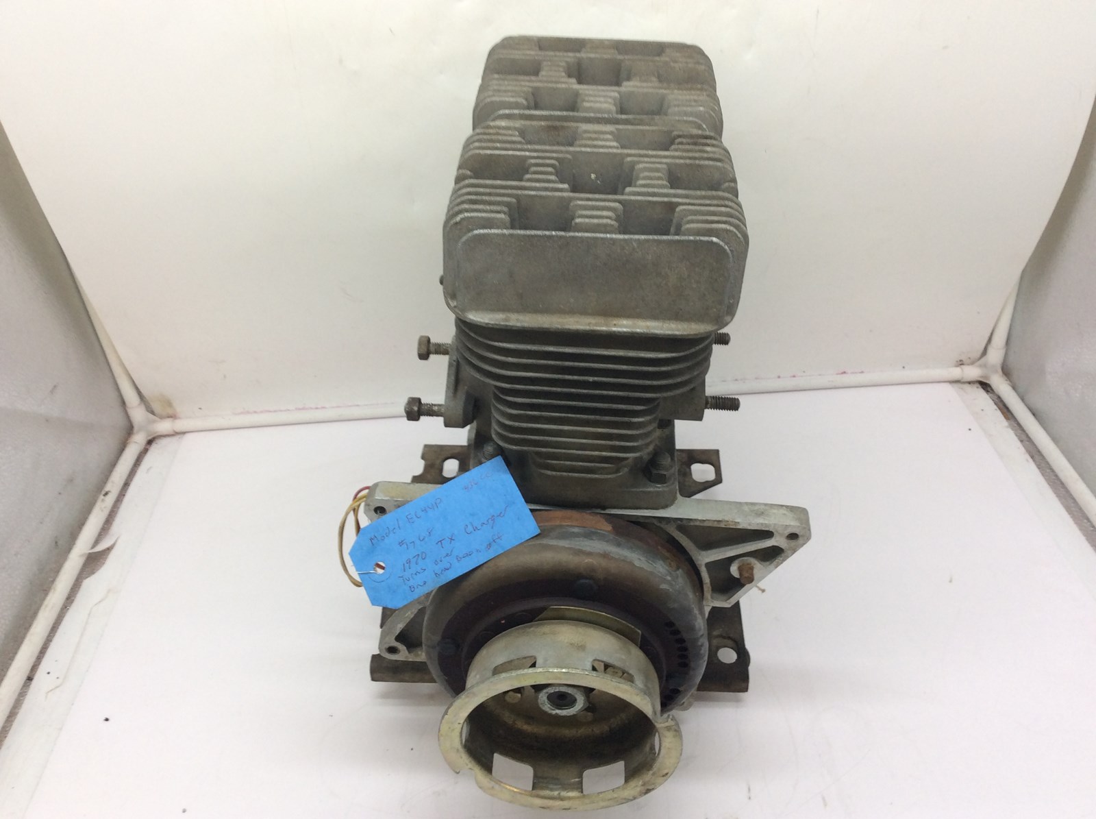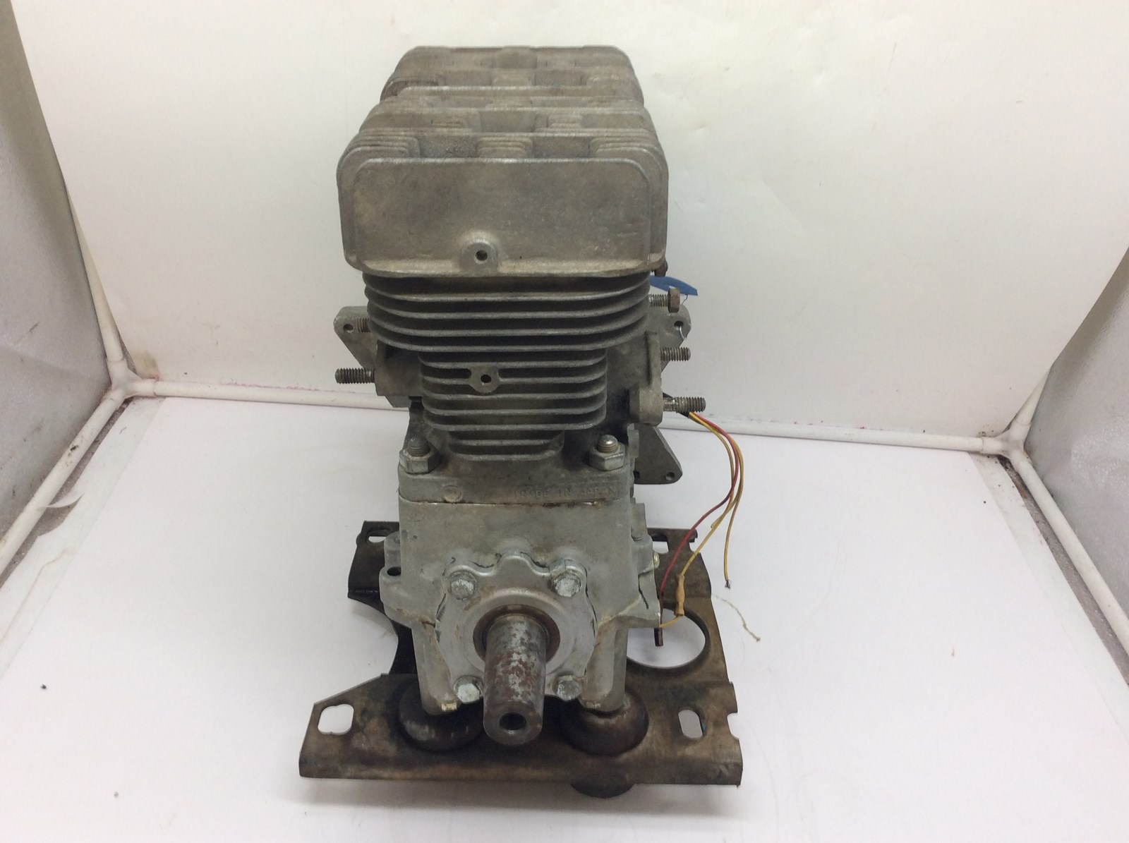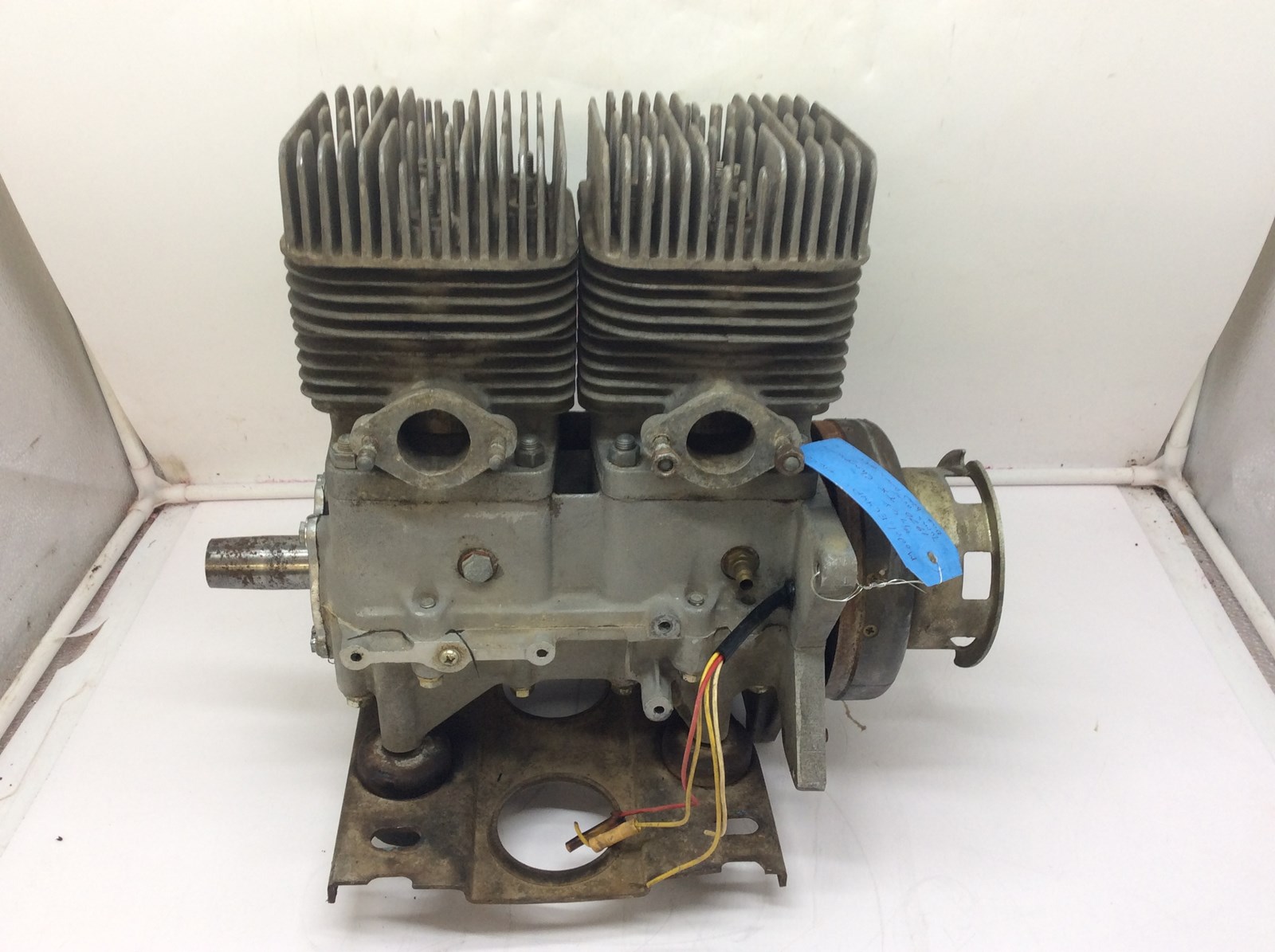 motor turns over, pistons and cylinders look okay. one side is missing the cylinder head nuts. being sold as is, for parts.