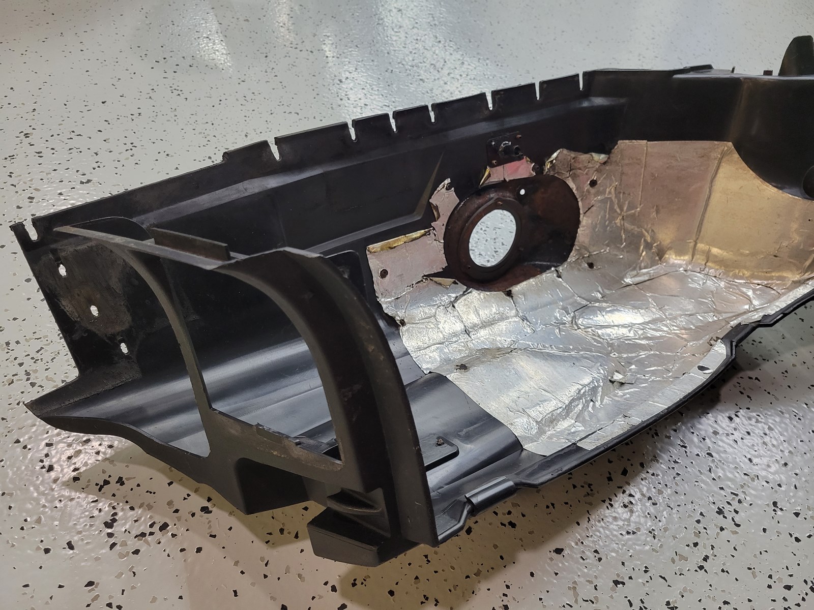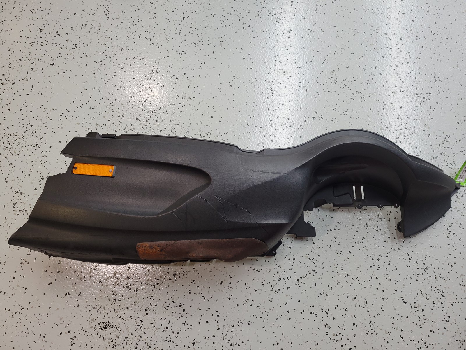 Good used right side belly pan with orange reflector, has normal wear from use.