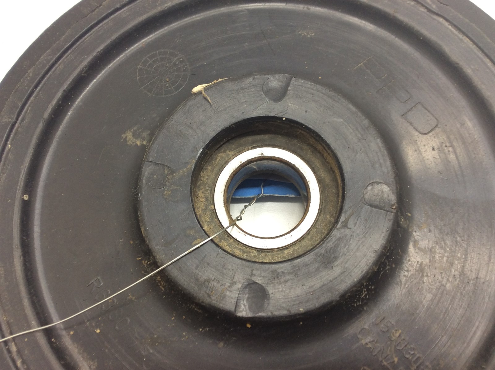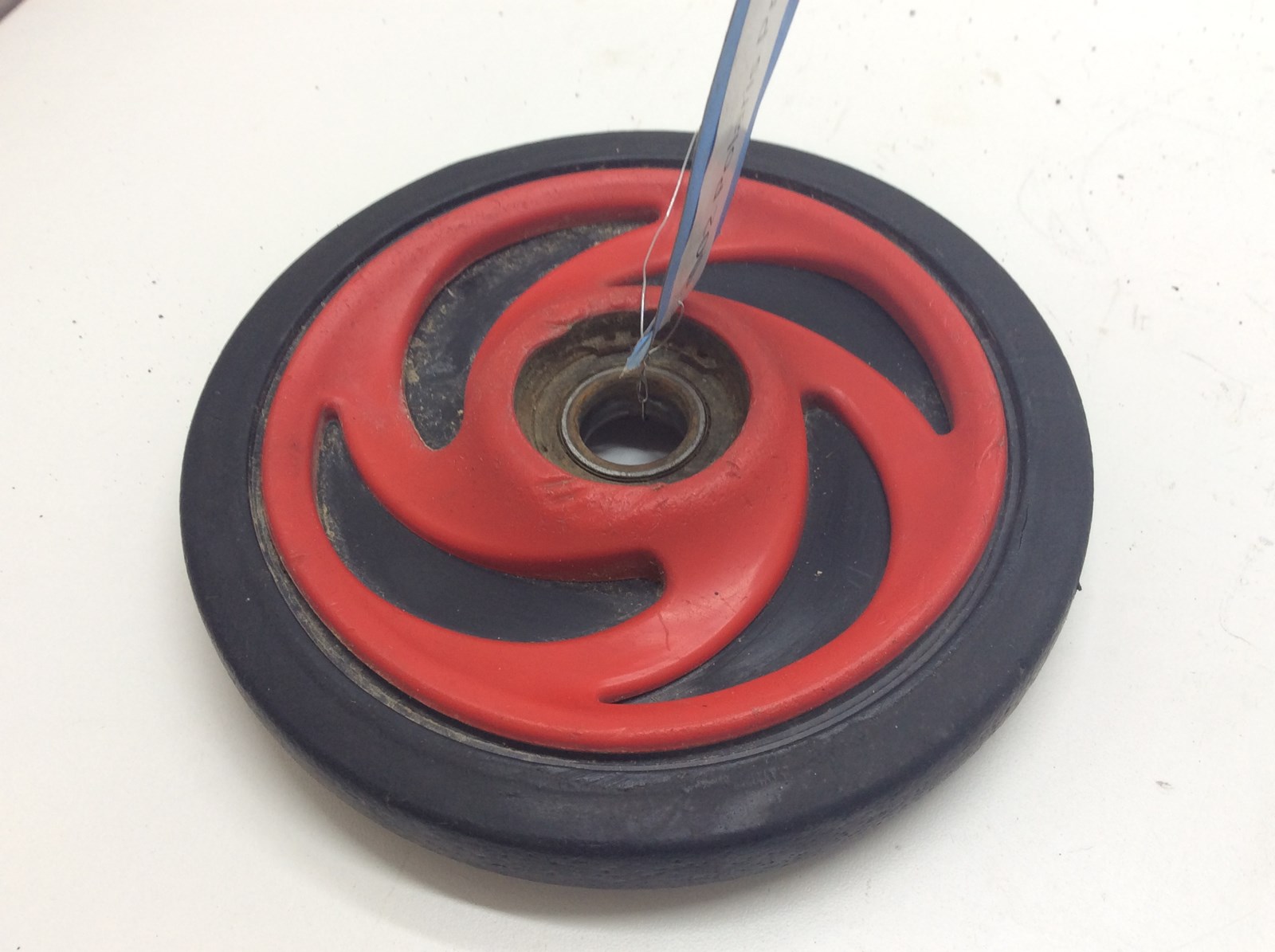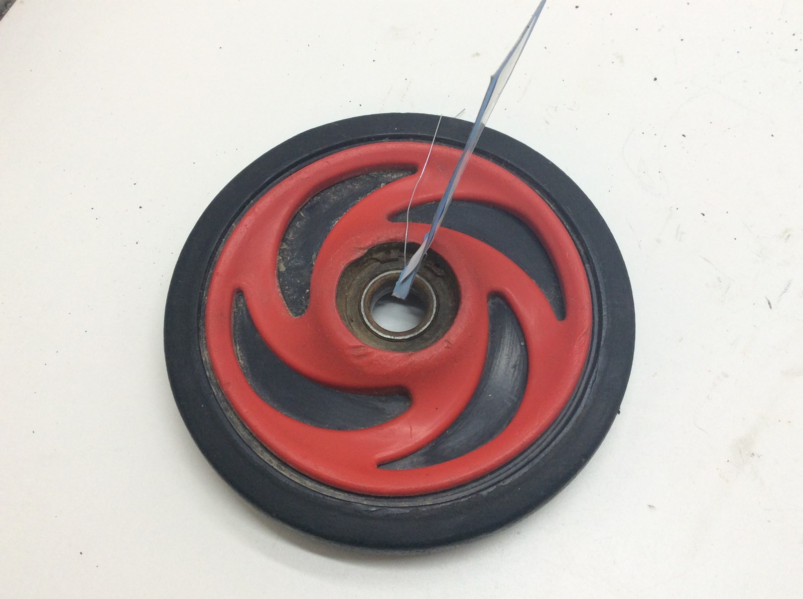 Good used OEM red idler wheel assembly. 6.38″. May need new bearing. Uses bearing 6004-2RS.