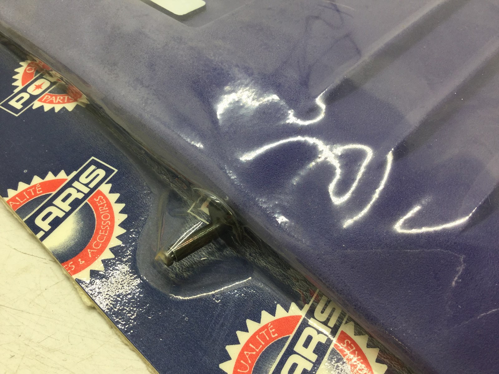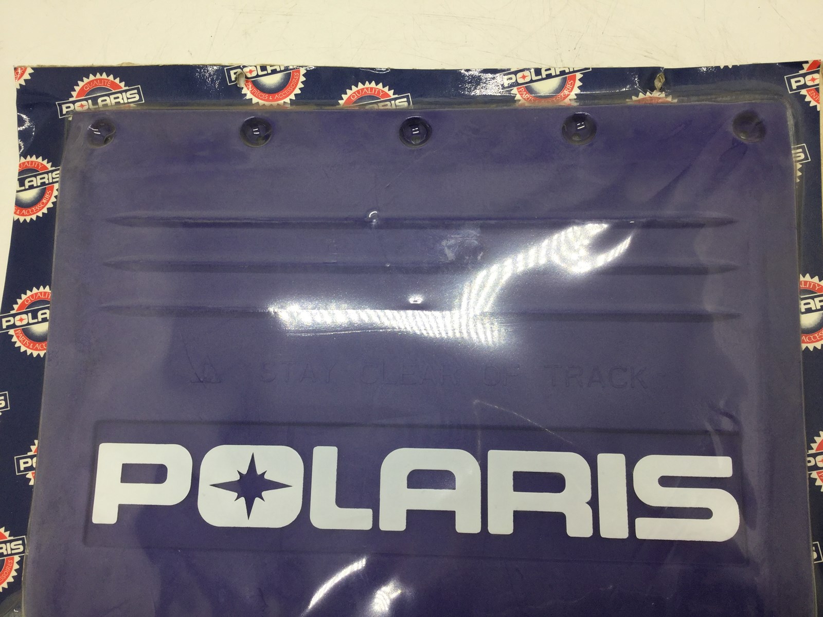 New in the package OEM Polaris snow flap, Blue with white letters, Includes hardware, Fits all Edge XC snowmobile models