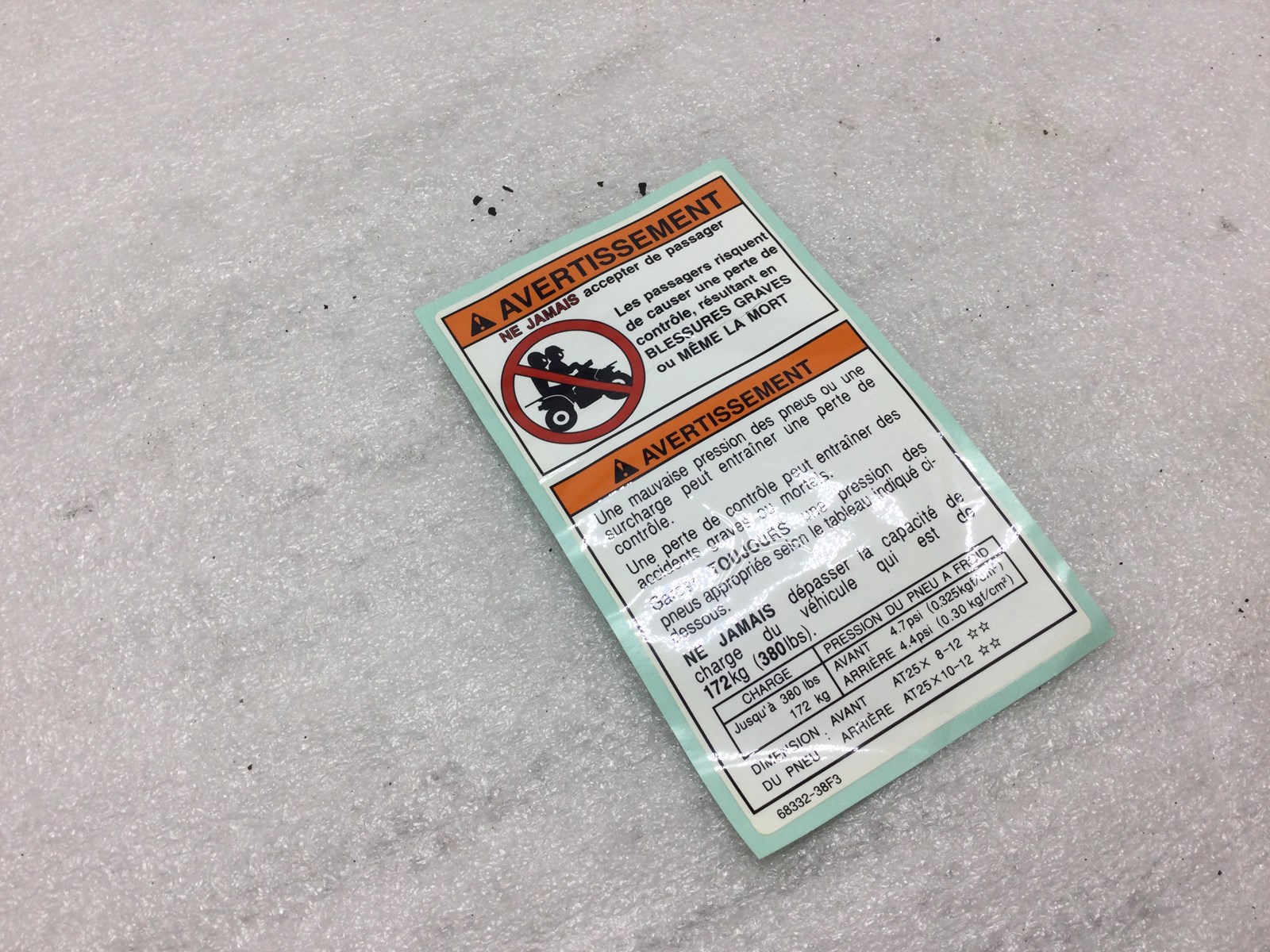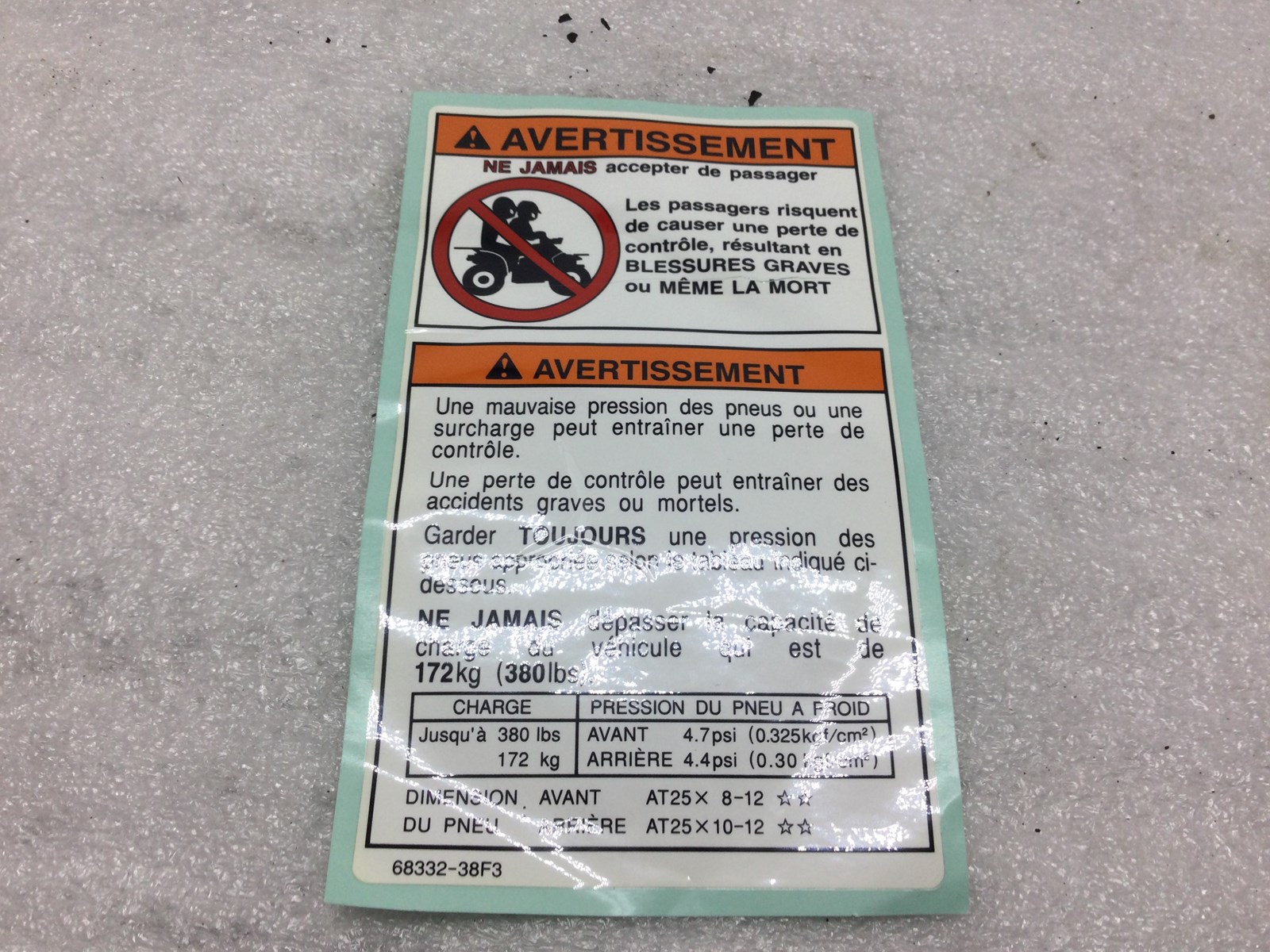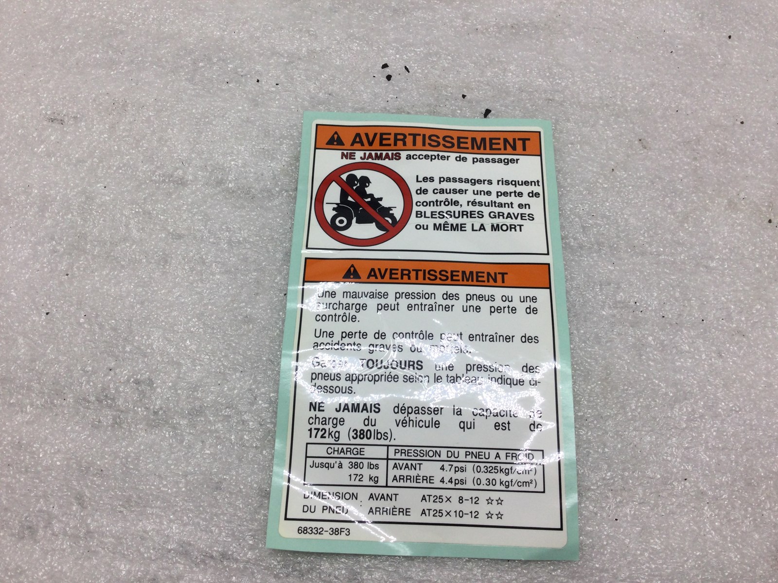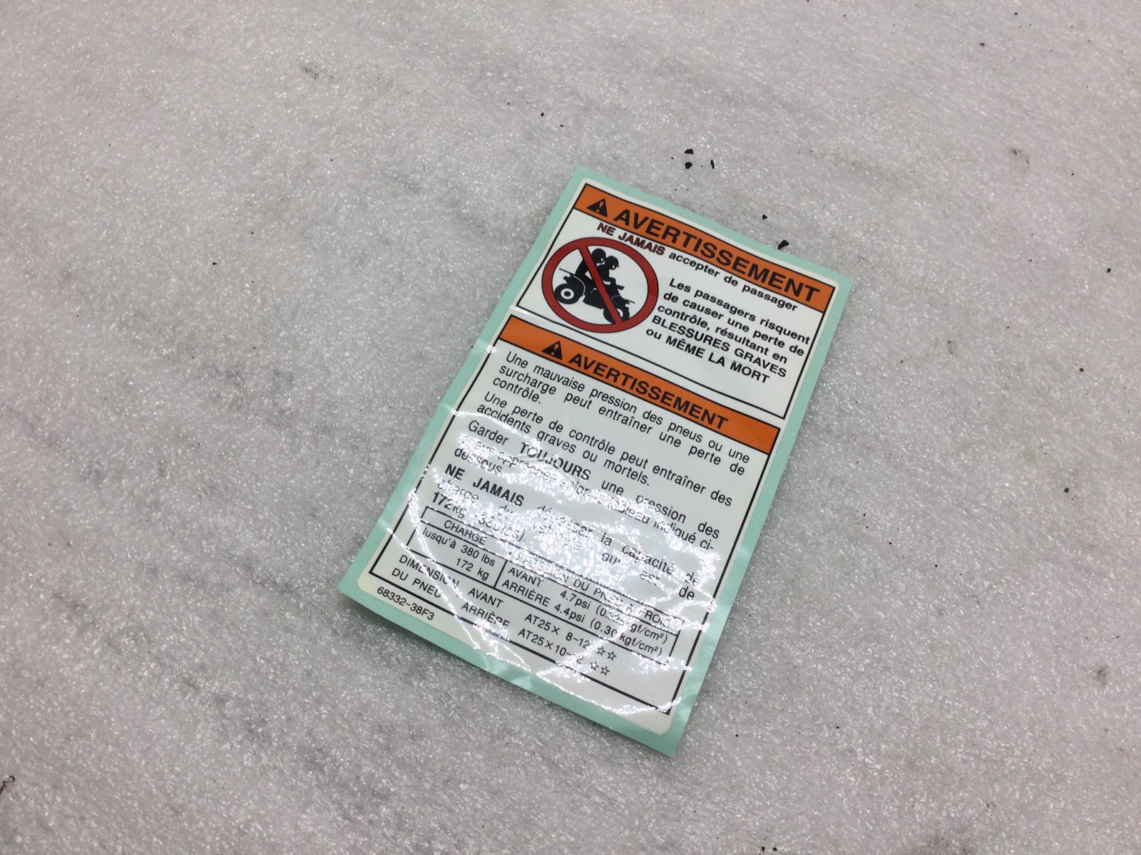 NOS OEM tire air pressure and passenger warning decal. This decal is in French not English.