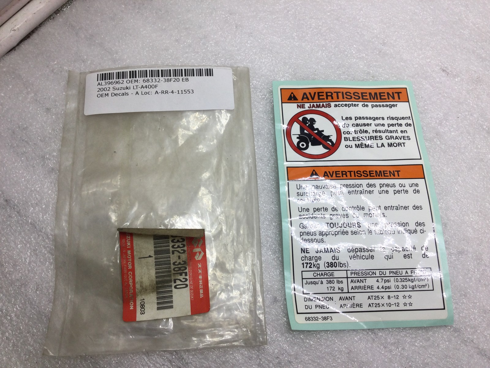 2003 Suzuki LT-F400F Eiger 4x4 Manual - LABEL, TIRE (CANADA ONLY)