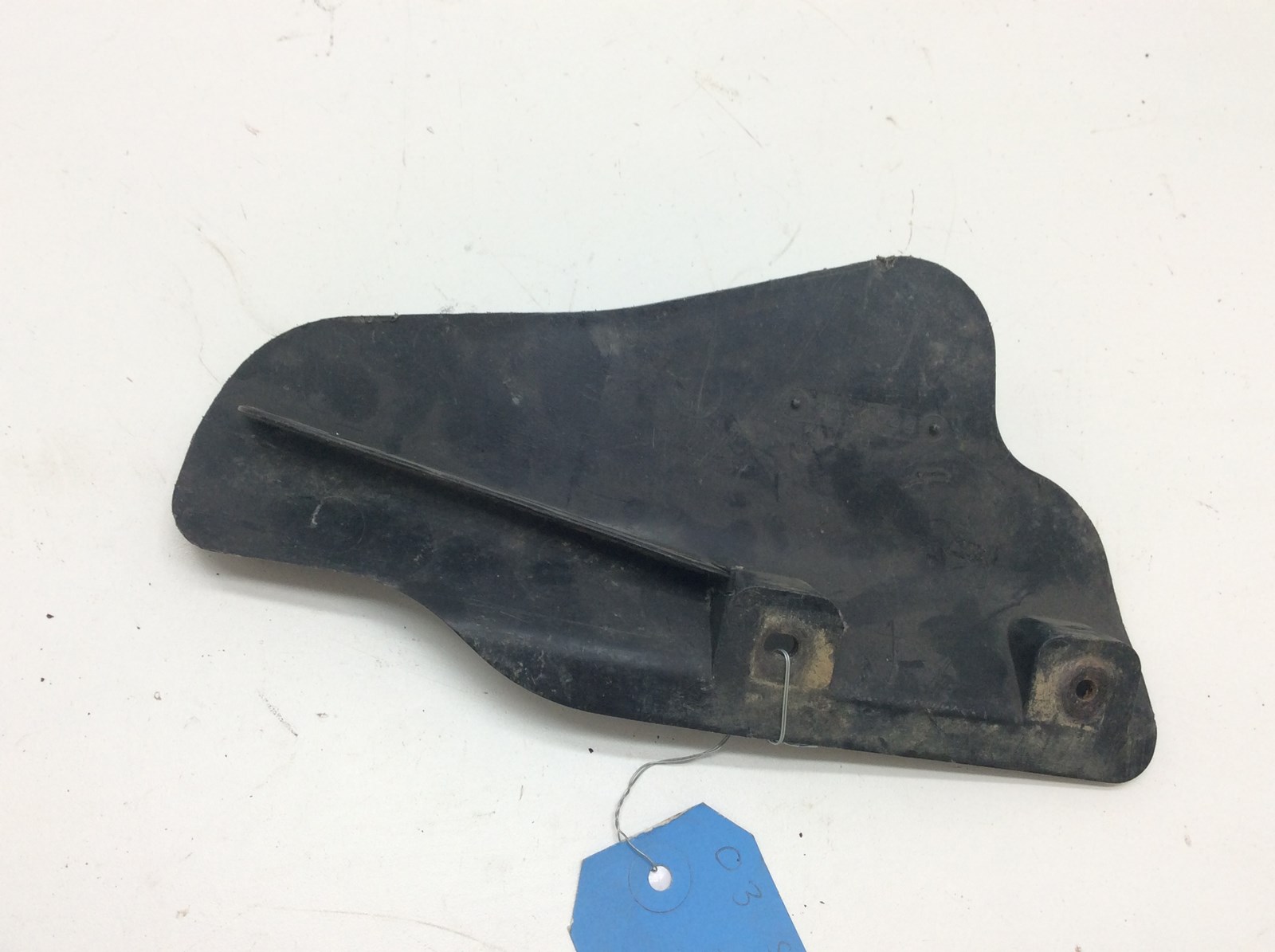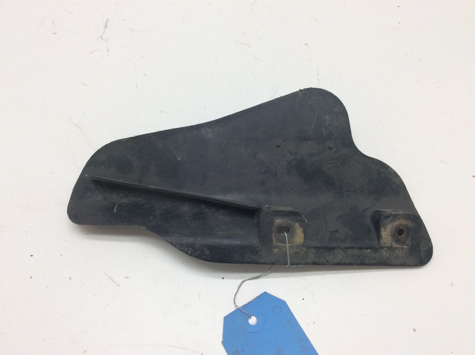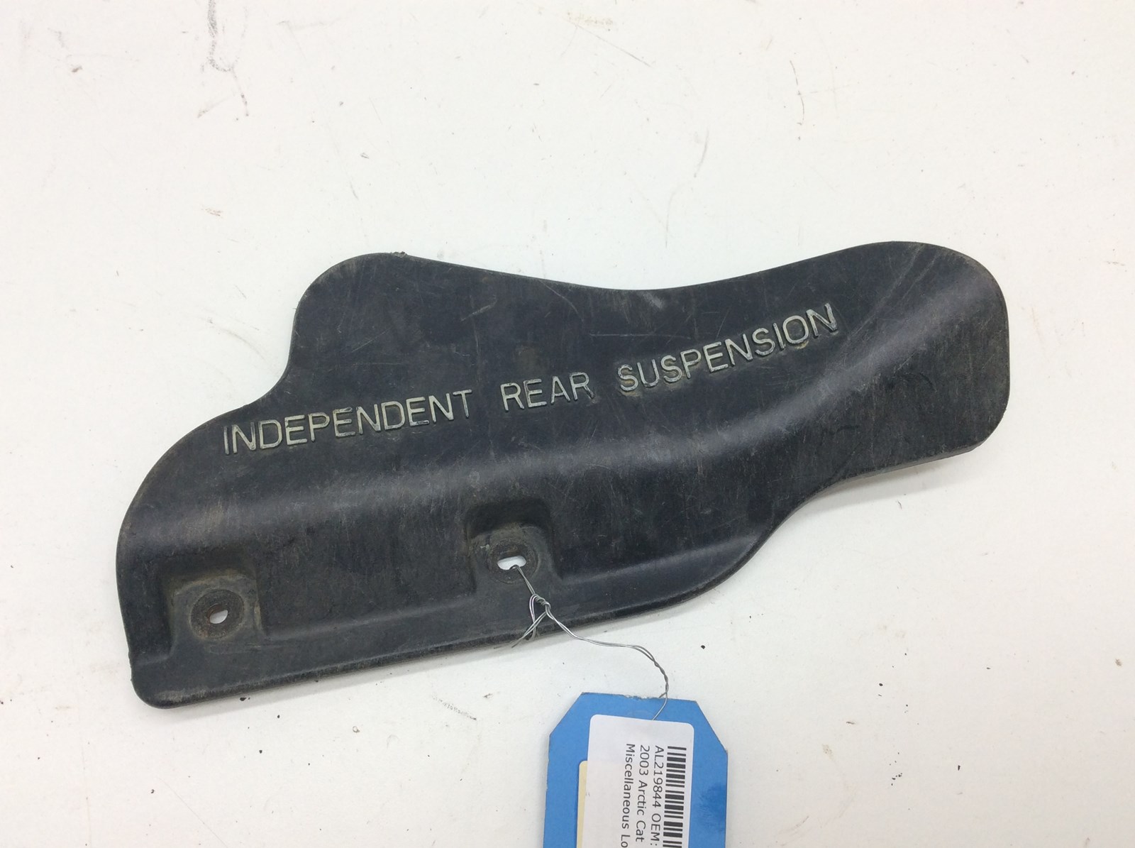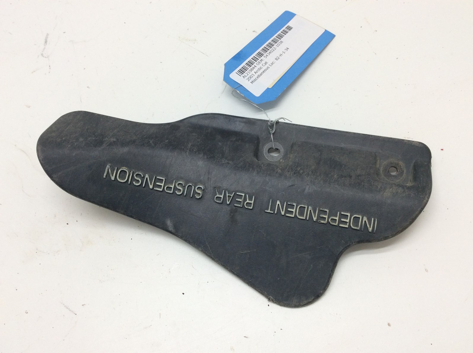Left rear CV shield, black with white lettering. Good used OEM.