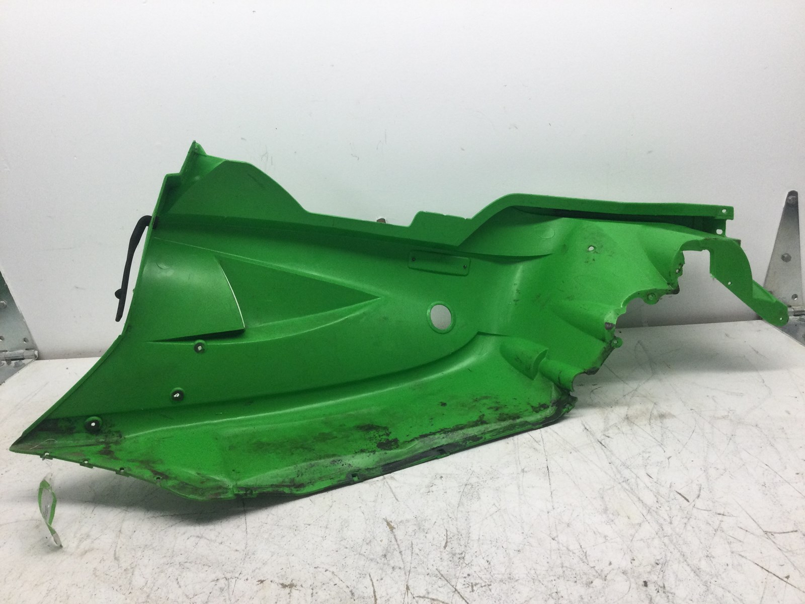 Good used left side belly pan. All mounting holes are in good shape. No cracks. Just some a few scuffs/scratches from use.