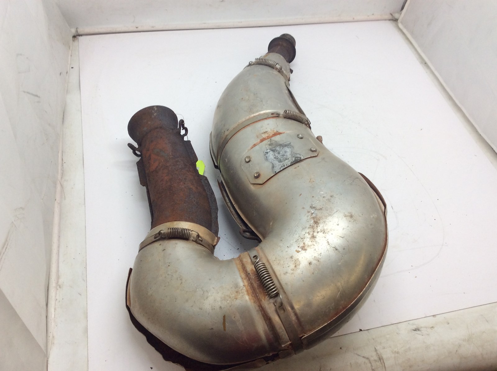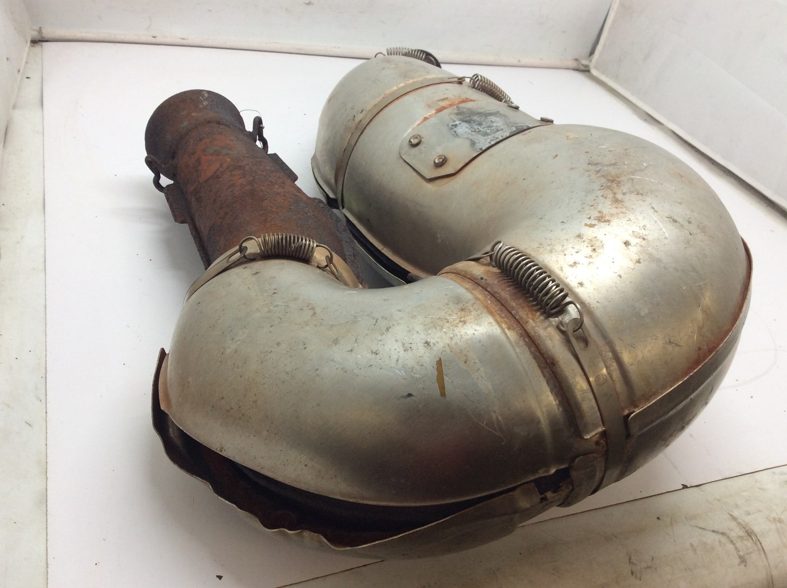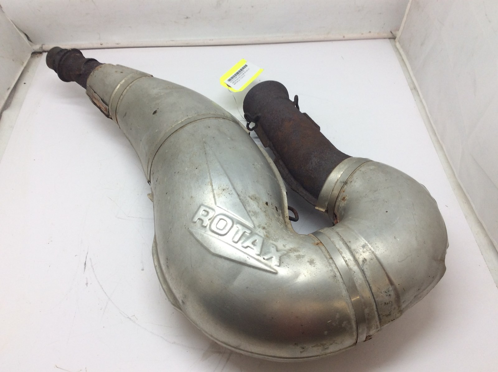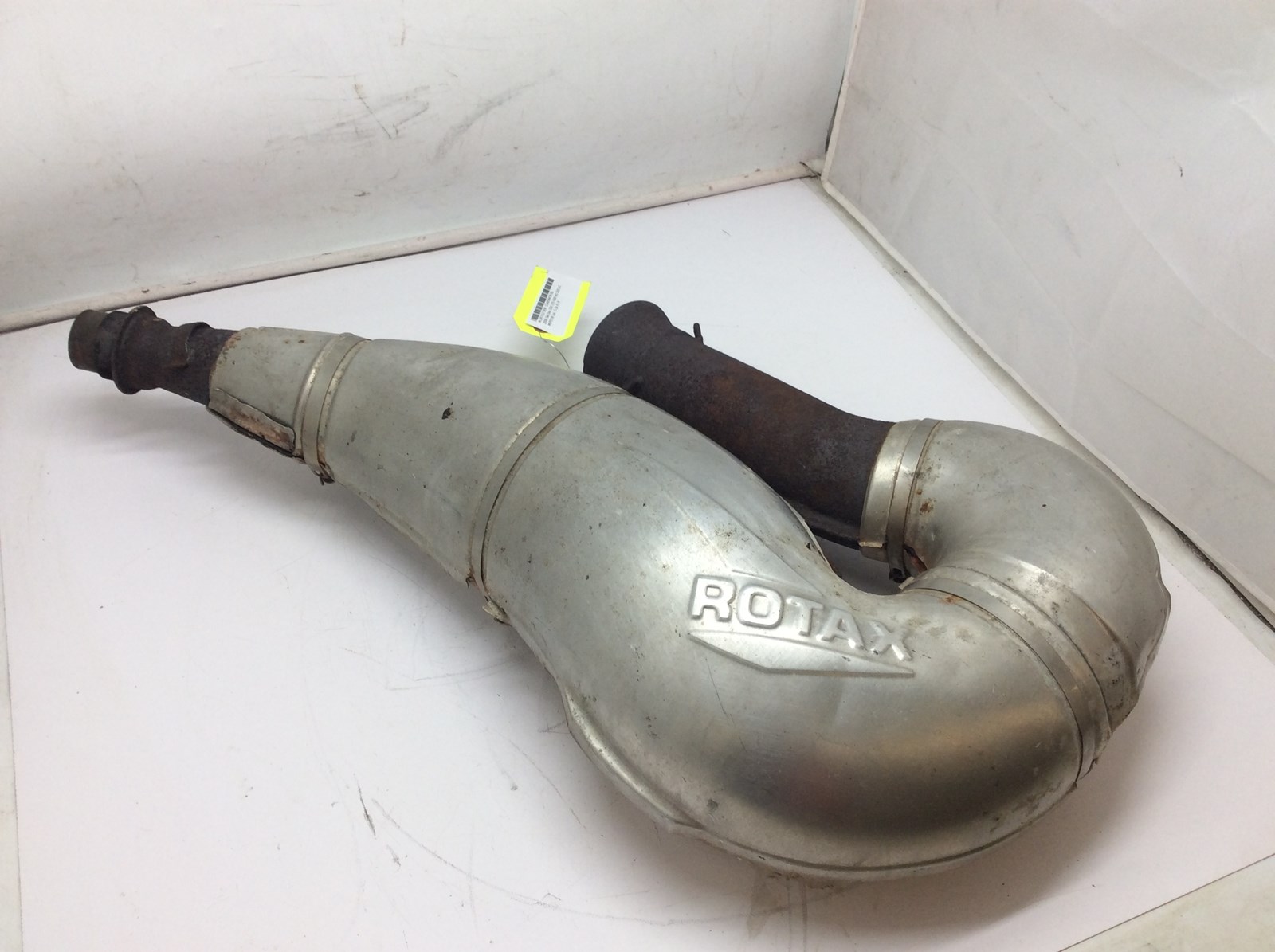 Good used tuned pipe with heat shield assembly. Shield has some dents and is pulled apart in one area. Pipe is rusty but solid. Flanges look good.