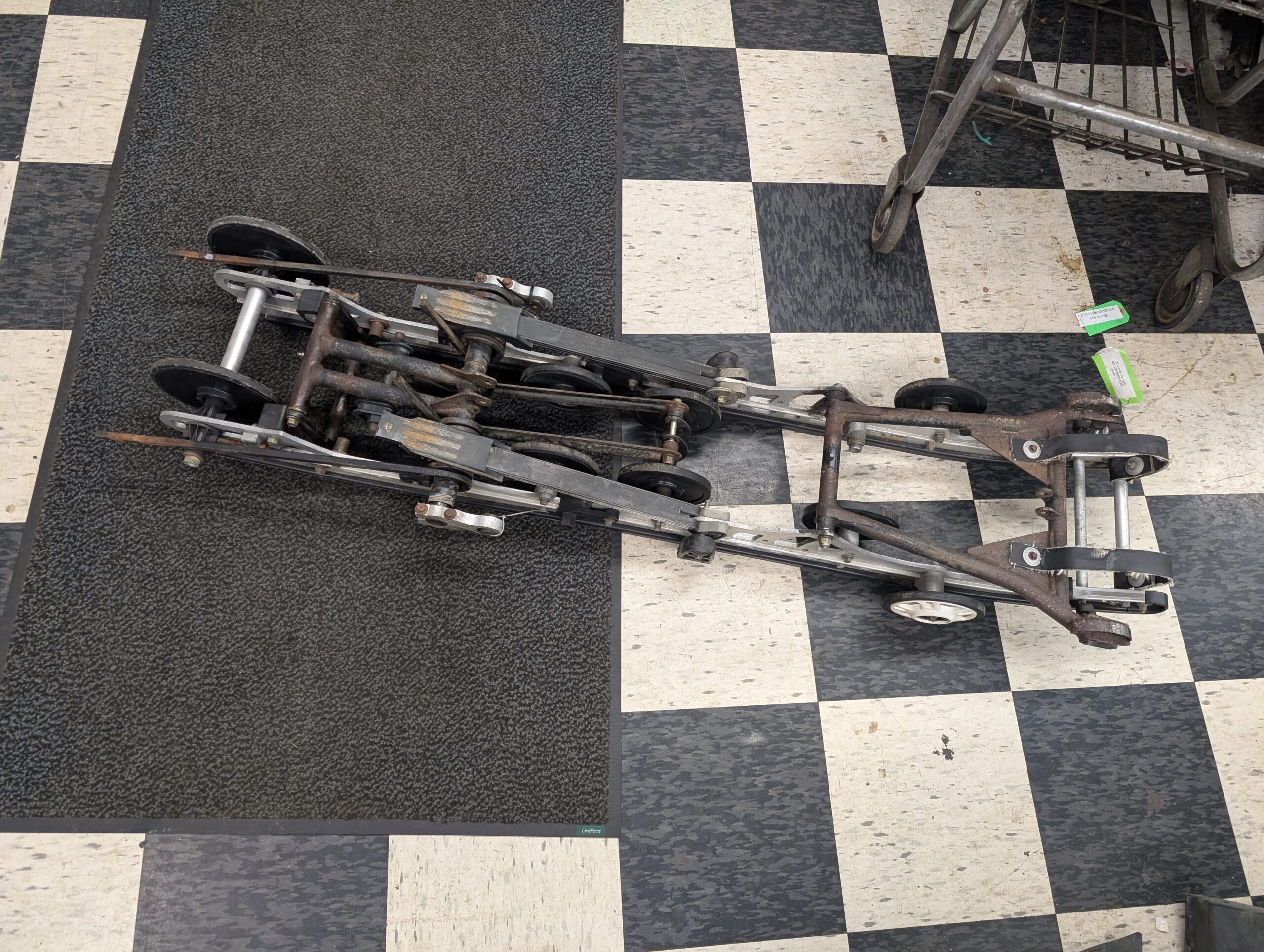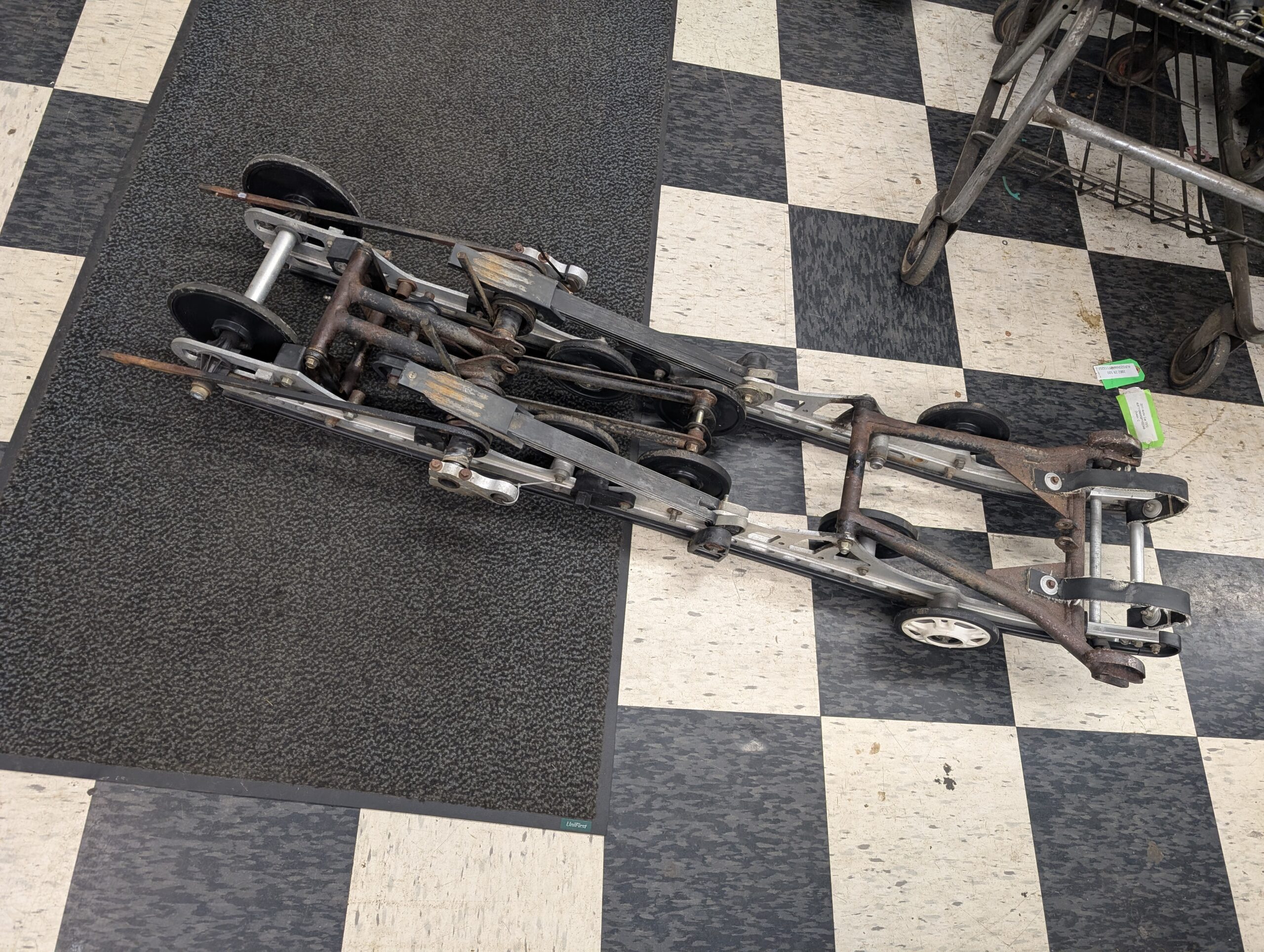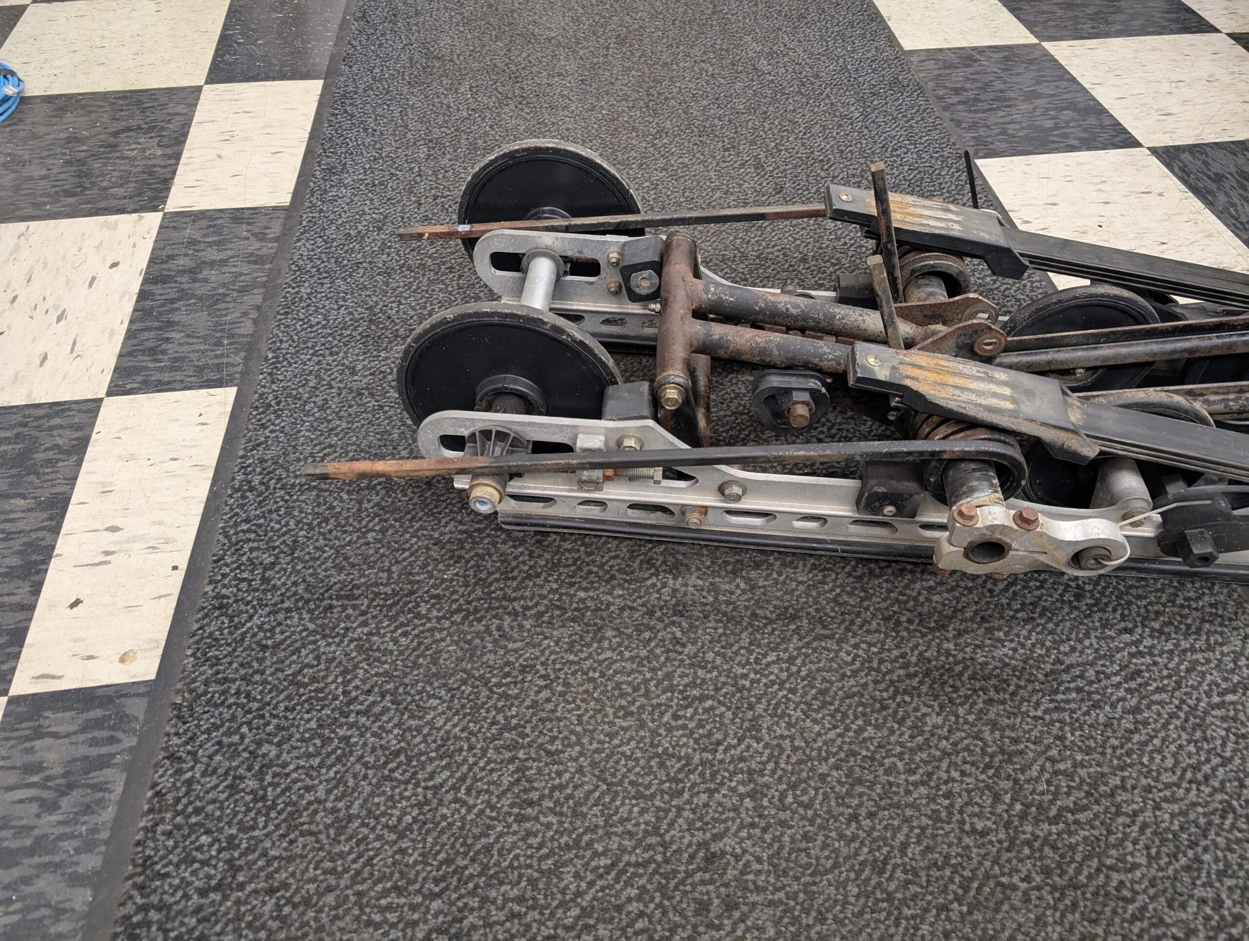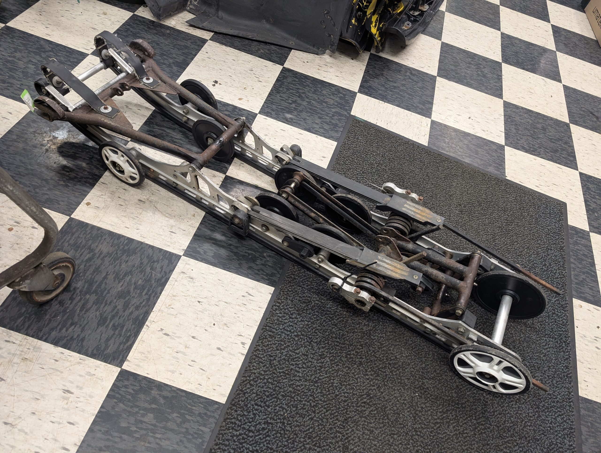 good used suspension, no shocks. fiberglass springs are cracked and worn pretty good. Missing one rear wheel. Missing top center idler wheels.