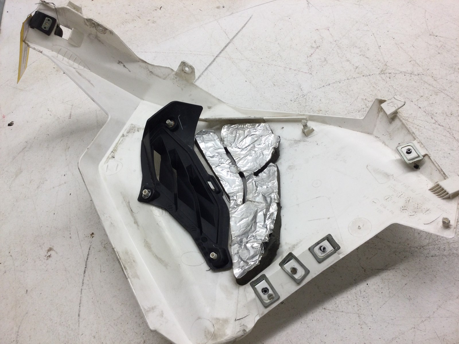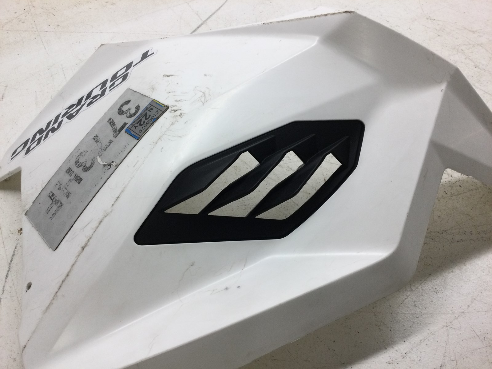 Used OEM right side panel fairing, White with decal, Has some good scuffs/scratches from wear but is usable, Has Black grill, No cracks or breaks