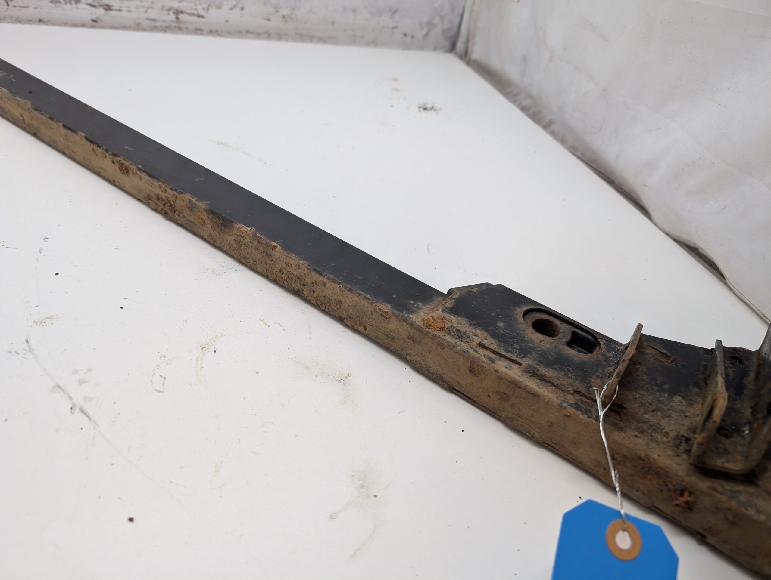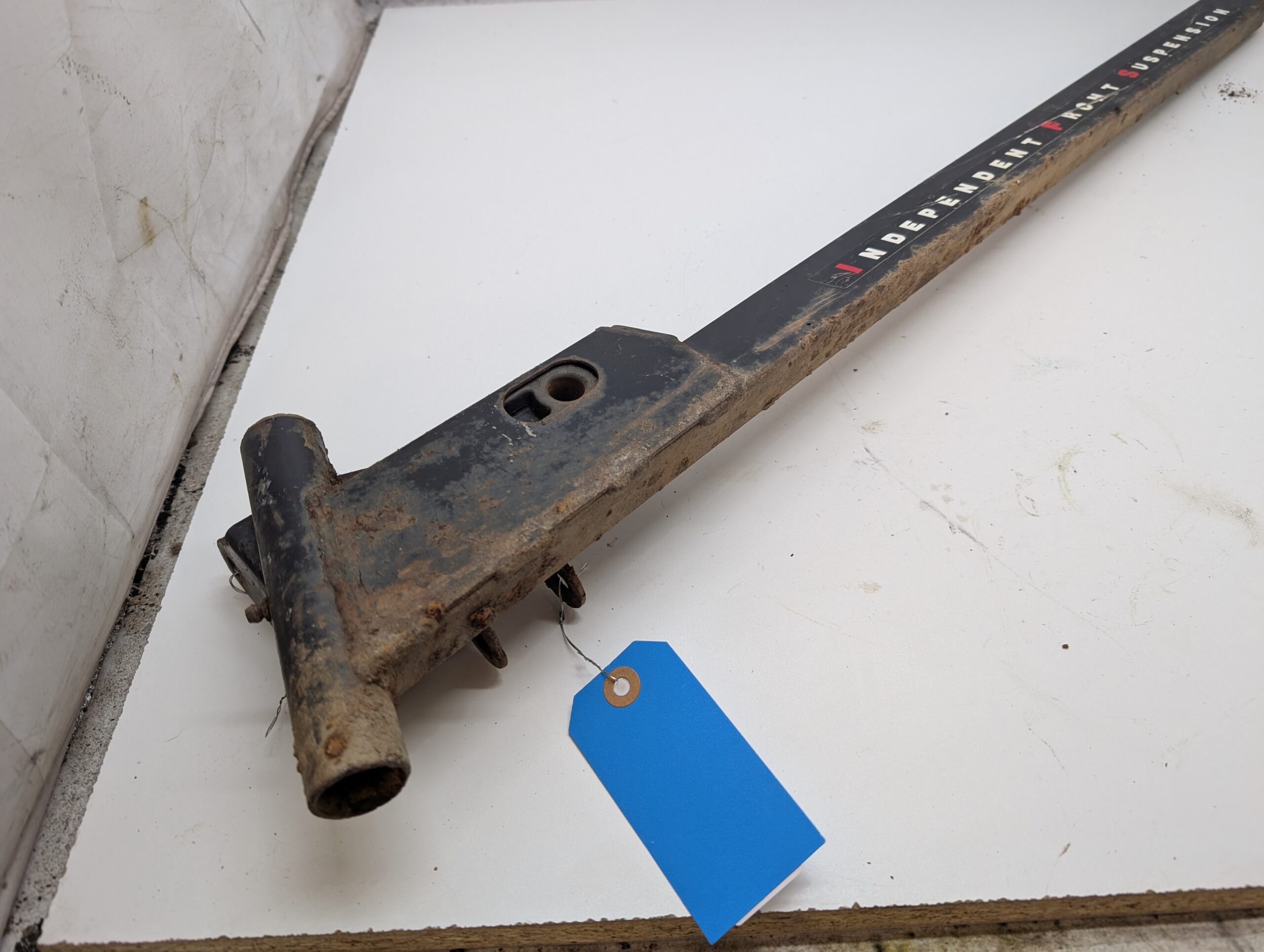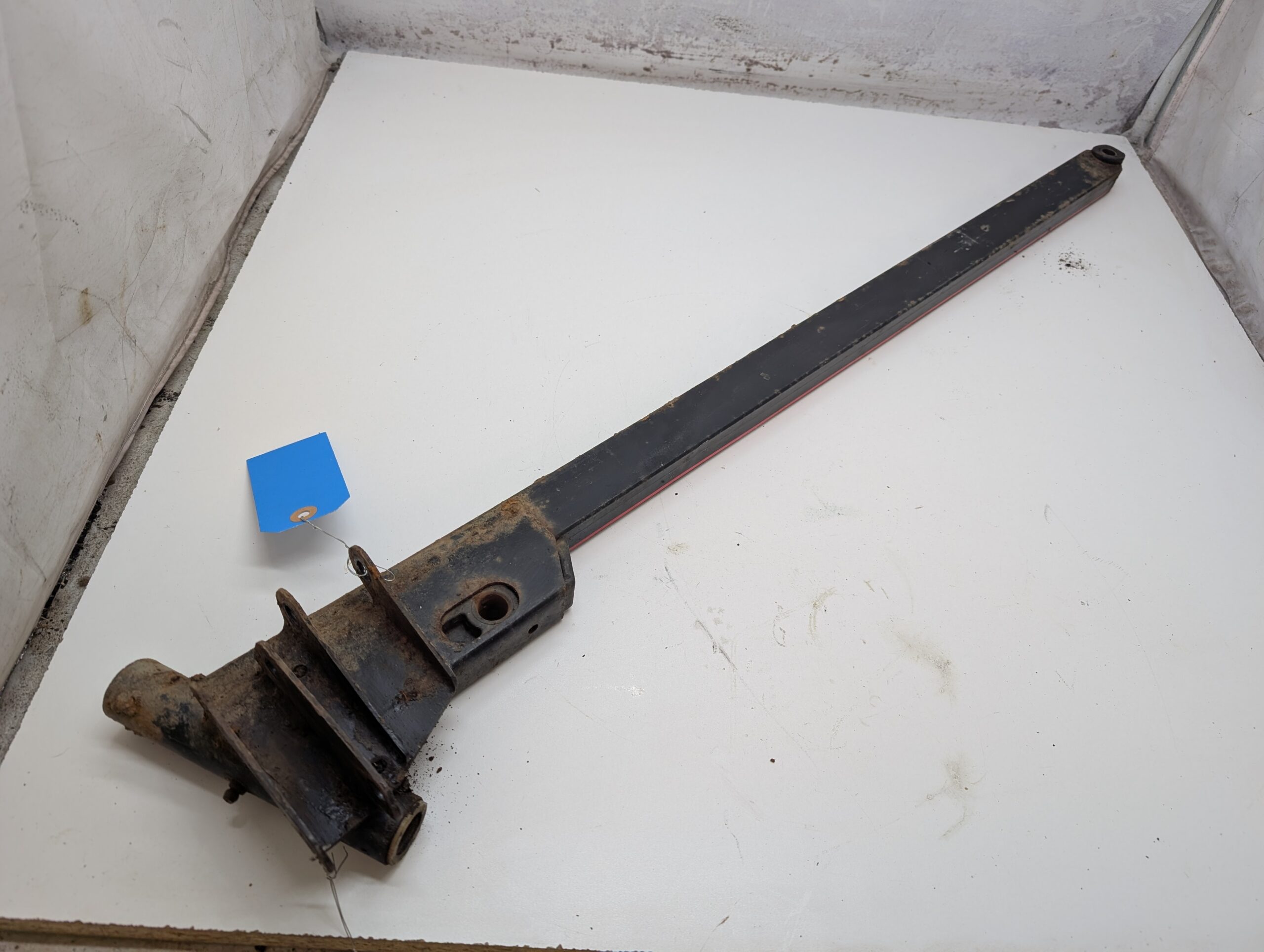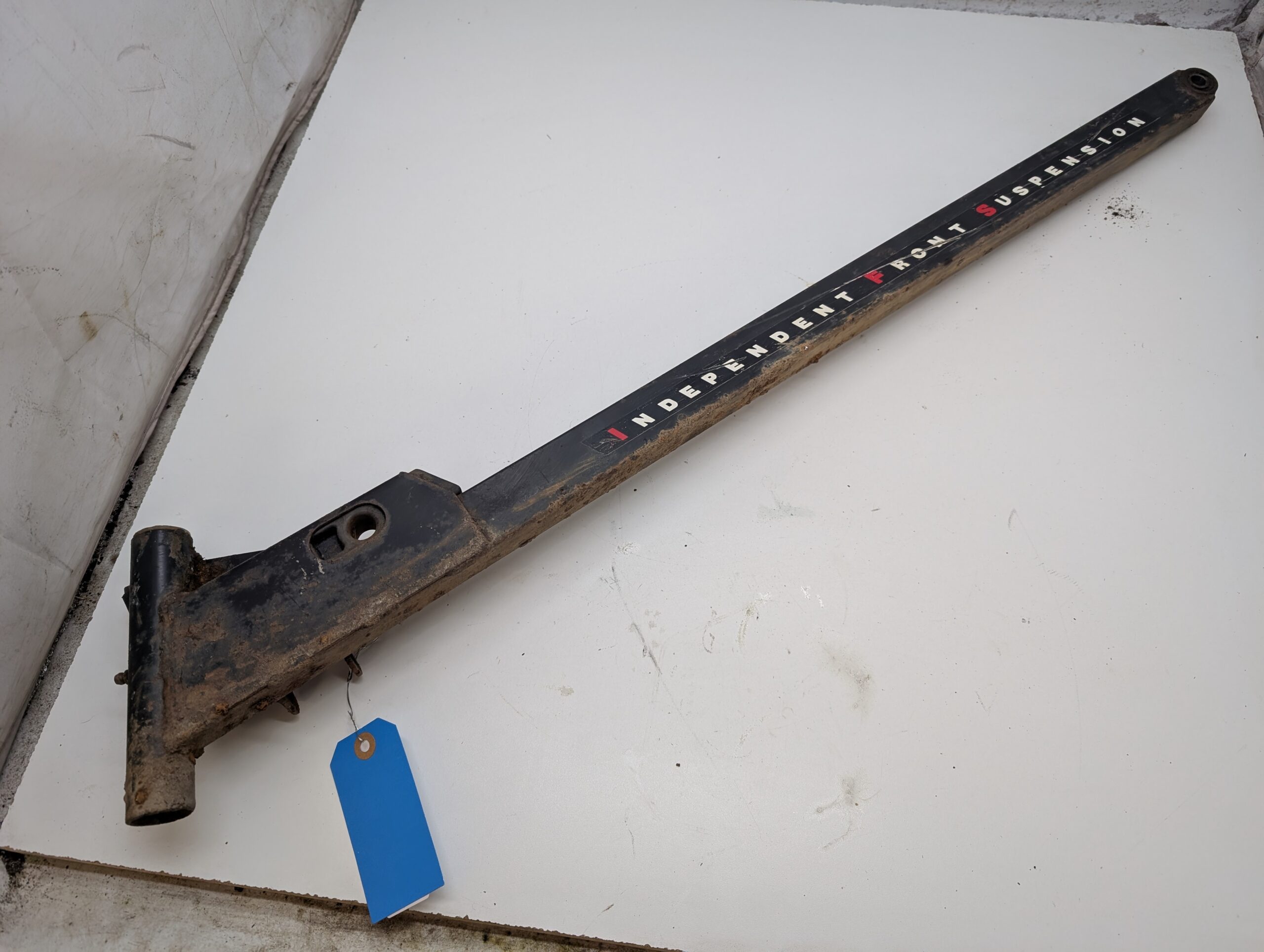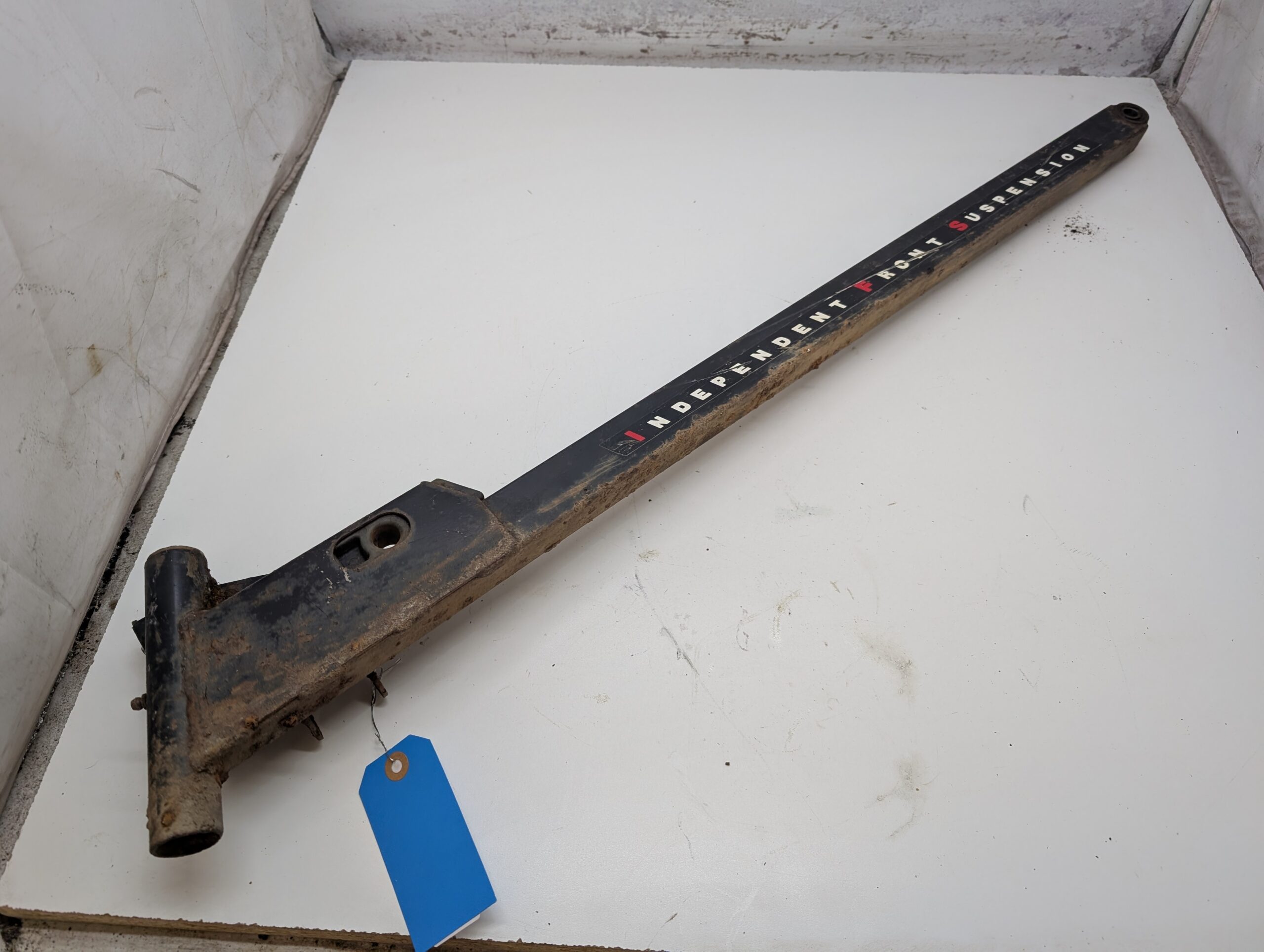 Good used left trailing arm, black with factory decals. Rusty, but solid and straight.