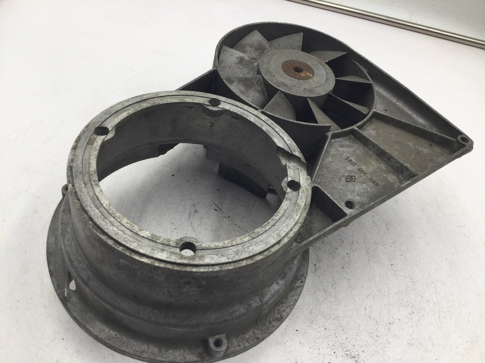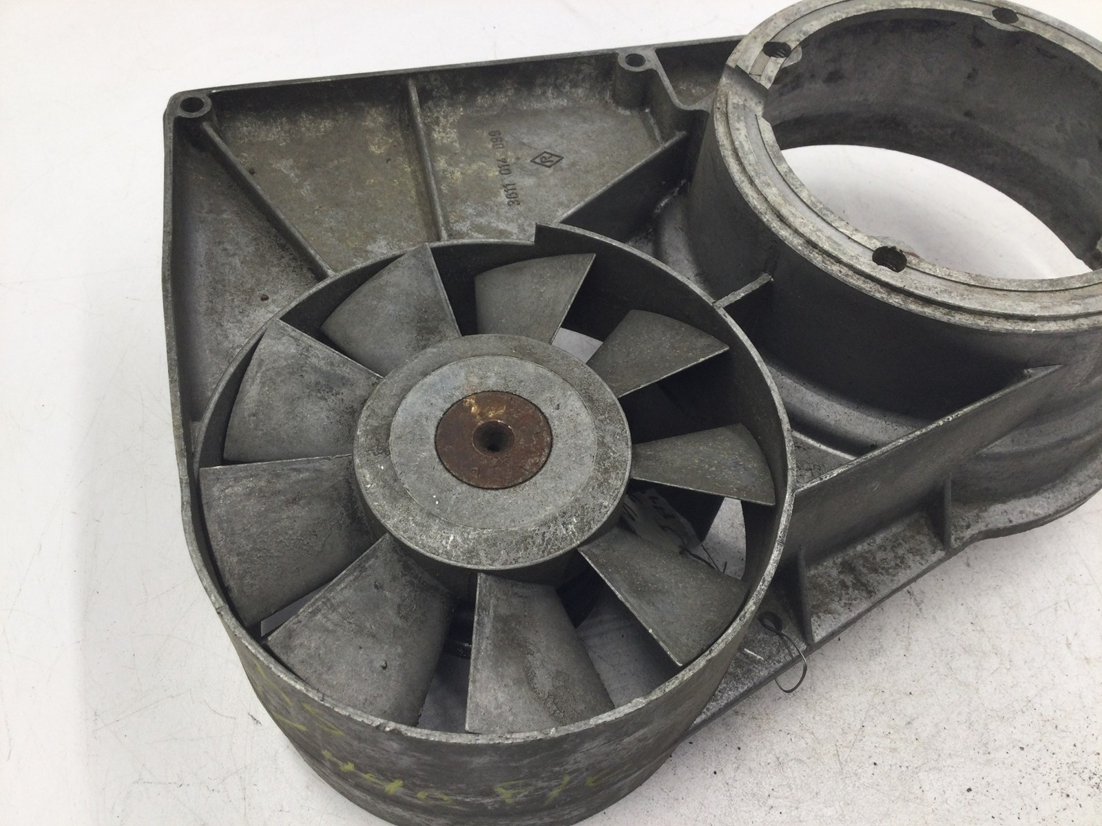 Good used OEM fan shroud, Has fan and pulley, Shows normal wear